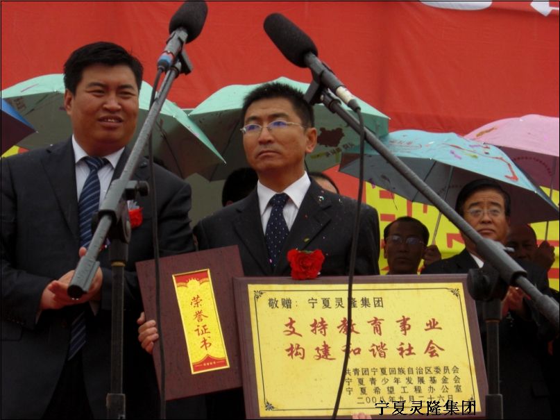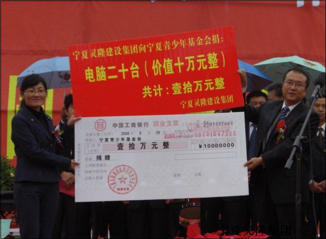 ? ? ? 2009年9月26日,在寧夏靈隆集團(tuán)龍辰苑一期開盤、二期開園儀式上,靈隆集團(tuán)董事長官國福先生向希望工程捐贈10萬元人民幣及20臺電腦,用于支持鹽池縣社區(qū)青少年信息中心建設(shè)和創(chuàng)建教育強(qiáng)縣工作。自治區(qū)團(tuán)委書記曹剛,鹽池縣委副書記、政府代縣長劉鵬云等領(lǐng)導(dǎo)出席了儀式。儀式上,曹剛書記向靈隆集團(tuán)頒發(fā)了榮譽(yù)證書和牌匾。政府副縣長楊舵代表縣委、人大、政府、政協(xié)講話,楊縣長在講話中對靈隆集團(tuán)熱心公益事業(yè),扶貧濟(jì)困的義舉表示感謝。他指出:寧夏靈隆集團(tuán)公司是我區(qū)建筑行業(yè)的驕嬌者,在區(qū)內(nèi)外建筑行業(yè)中享有很高的聲譽(yù)。公司董事長官國福先生懷著回報桑梓的淳樸情感,在得知家鄉(xiāng)創(chuàng)建自治區(qū)教育強(qiáng)縣強(qiáng)鄉(xiāng)鎮(zhèn)工作還有很多困難后,以實(shí)際行動支持家鄉(xiāng)教育事業(yè)發(fā)展,體現(xiàn)了民營企業(yè)家舍私利作公益、化小愛為大愛的高尚品德。同時希望更多的有識之士和愛心企業(yè)能積極參與希望工程,幫助更多的貧困學(xué)生順利完成學(xué)業(yè)。